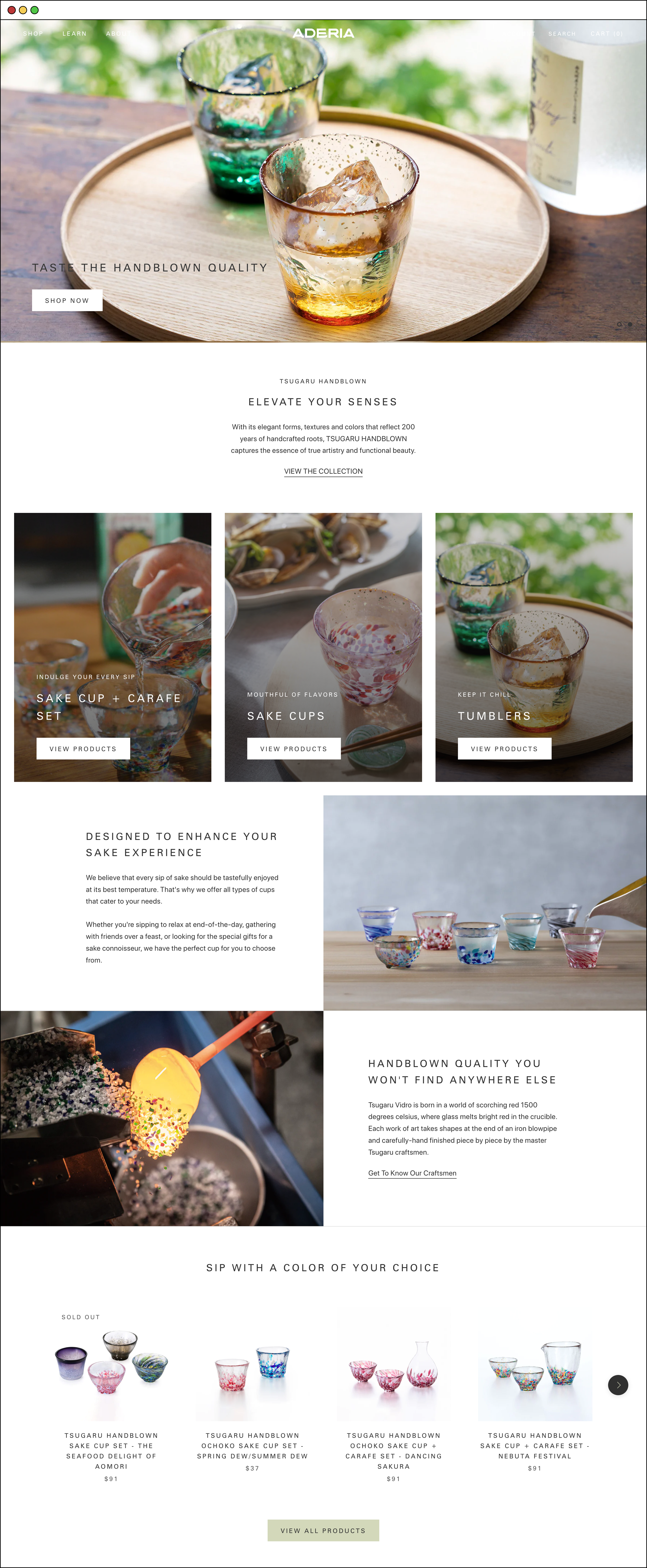 When creating a website for Aderia Glass, we wanted to make sure it reflects the poetic and aesthetically-pleasing nature of their “handblown” glassware - as well as 200 years of glass making history deep-rooted in the town of Tsugaru. Every handmade piece is an inspiration from nature transformed into glassware by the hands or Tsugaru glass craftsman – and we wanted to express its essence through product names, descriptions, and company blogs.